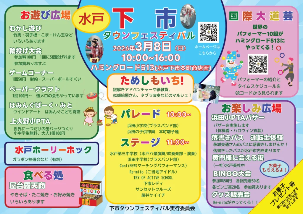 下市タウンフェスティバルは、水戸市本町のハミングロード513を舞台に開催される、地域みんなでつくる一日限りのお祭りです。